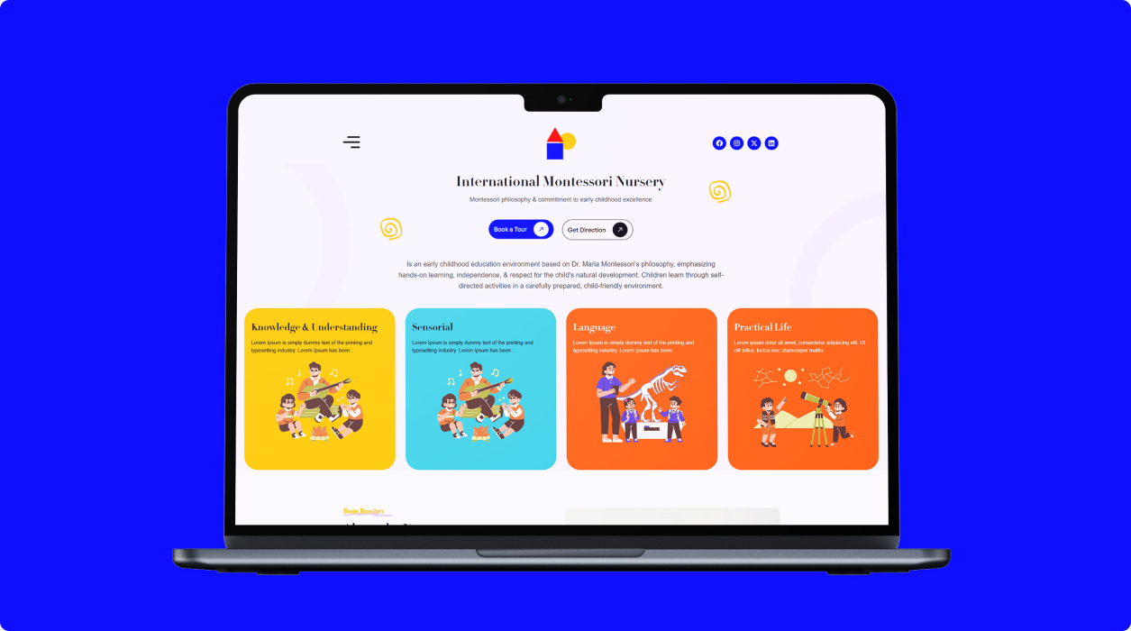The Montessori Nursery Platform was designed as a bilingual, child-focused website to reflect the warmth, care, and educational values of the nursery. The goal was to create a responsive, cheerful, and intuitive platform where parents could learn about the nursery’s philosophy, explore upcoming events, view galleries, and easily book tours. With branding rooted in Montessori principles, the website balanced functionality with a nurturing aesthetic.